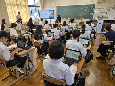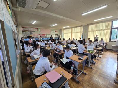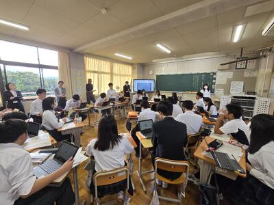 5時間目は3Cの国語、角川先生の授業をみんなで参観しました。石垣りんの詩を通じて、人間、社会、自然等に対して自分の意見を周りの人に聞いてもらい深めるという活動でした。班で取り組んだり、全体で交流したり、タブレットも活用したりしました。
