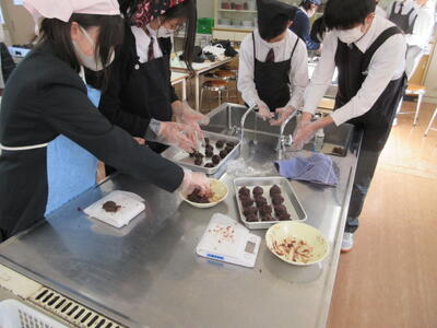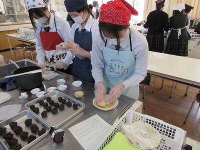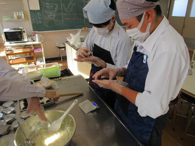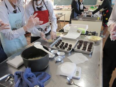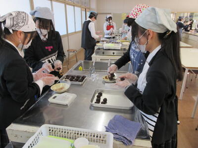 3年生の家庭科では調理実習が行われています。何をつくっているかというと、「おはぎ」です。