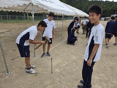 あすの体育大会に向けて3年生と陸上競技部が準備をしてくれました。楽しく仕事ができるところが素晴らしい。