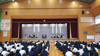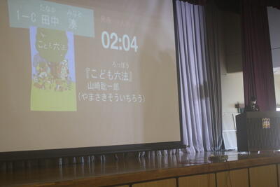 本日は、全校ビブリオバトルを行いしました。学級ビブリオバルトでチャンプ本に選ばれた8名が自分のおすすめ本を紹介しました。表現力豊かに持ち時間3分をうまく使う生徒も多く、読書活動にプラスして、表現力や思考力を高める機会になっているような感じもありました。写真二枚目の生徒が全校チャンプに選ばれました。
