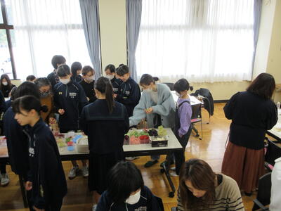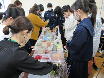 PTA主催でハーバリウム教室を開催したところ、約30名の方が参加してくれました。おしゃべりしながら楽しくものづくりに取り組みました。それぞれ出来上がった作品は個性的で、「コンセプトは」と聞くと、パッと「オータム」と答えてくれる生徒もいました。