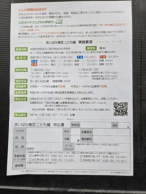 まいばら検定のお知らせ 投稿: 大東中学校 (10/07) カテゴリー: 今日の出来事 私校長は昨日まで国スポ陸上競技の審判をし、本日6日ぶりに学校に来ました。 一時間目の授業を参観しましたが、落ち着いて頑張っている姿に感心するとともにホッとしました。 ところで既に配布済みのようですが改めてまいばら検定についてお知らせします。是非とも多くの生徒に挑戦してほしいです。 申し込みは各自でお願いします。 Tweet -