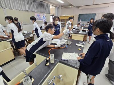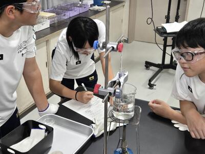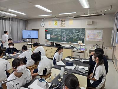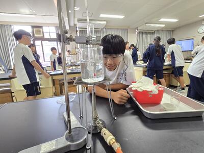 お邪魔しまーす!授業参観9 投稿: 大東中学校 (12:38) カテゴリー: 授業の様子 シリーズ9回目は眞野先生の理科にお邪魔しました。1Cのエタノールの沸騰する温度の実験を参観させてもらいました。 まず黒板の字が美しく見やすかったです。実験はどうしても時間がかかるので前もって準備もしてくださっています。 さて実験。3~4人が協力して取り組んでいました。ただガスバーナーの点火にてこずっていたグループもいました。 みんな保護眼鏡をかけてなんかかっこやかったです。この中から未来のノーベル賞が出てきてほしいものです。 Tweet -