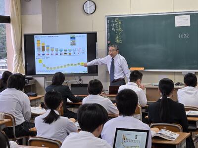 2年生の技術ではエネルギーの学習をします。そこで本日は工学博士の中岡章先生に千葉県からきていただきお話を聞きました。