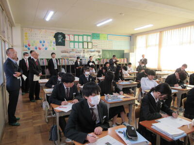 市教委訪問 投稿: 大東中学校 (11/10) カテゴリー: 今日の出来事 今日の午前は、市教委の訪問があり、すべての学級の授業を見ていただきました。 また、その後学校運営について説明し、指導を受けました。 教えていただいたことを明日以降の教育活動に生かしていきたいと思います。 生徒の皆さんは、10名上の方が教室に入ってこられ、びっくりしたと思います。 Tweet -