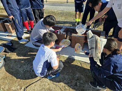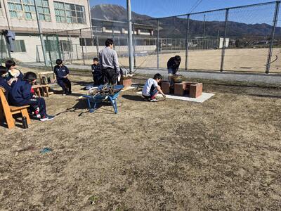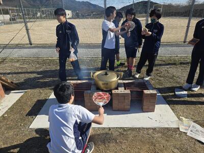 サッカー部防災訓練 投稿: 大東中学校 (12:08) カテゴリー: クラブ活動 サッカー部では練習後に炊き出し訓練を行いました。 かまどベンチを活用し、自分達で新聞紙に火をつけ、小枝を燃やし、薪に火をつけ、湯を沸かしました。 そのお湯でレトルトカレーを温めてみんなで食べました。 私は火がつくまでは見守ってましたが出張に出たので、カレーのお味はどうだったでしょうか?また教えてください。 万が一、災害で大東中が避難所になったときには、このかまどベンチを活用します。 今日はその訓練を行いました。 Tweet -