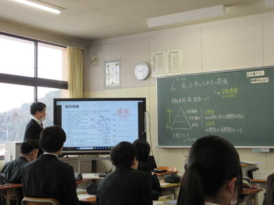 「自然に学ぶ」を学ぶ理科 投稿: 大東中学校 (11:22) カテゴリー: 授業の様子 3年B組の理科にお邪魔しました。 食物連鎖の学習で、「生態系の個体数のバランスか崩れるとどうなるか」というテーマを考えていました。 植物とネズミとイタチを例に仮説を立てながら学習が進みました。 一時間一緒に授業を受けましたが、まさに本校の校訓「自然に学ぶ」を学んでいました。 自然界の素晴らしいというかうまくできている摂理を学んでいました。 また、伊吹山の現状(シカ問題)も参考にしながら、思考力・判断力を高めていました。 それにしても鳥居先生の板書は美しいです。 Tweet -