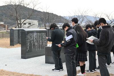 2年平和学習続編 投稿: 大東中学校 (15:47) カテゴリー: 今日の出来事 2年生の平和学習は、深まってきました。 本日は、市内在住の瀬戸川さん(米原市遺族会会長)のお話を聞きました。滋賀県も被害があった話や、自分の家族が戦争に行かれた話等を聞きました。 そのあとは、平和の礎へ行き、平和セレモニーを行いました。 修学旅行に向けて、着々と学びを深める2年生です。 Tweet -